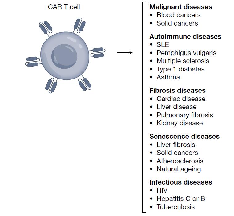 近年来,科学家们一直在努力将CAR-T疗法应用于除血液类癌症以外的癌症类型,例如各种实体瘤。而一些早期研究结果显示,CAR-T疗法的下一个进展可能是在癌症以外的领域,CAR-T疗法可能在自身免疫病(系统性红斑狼疮、寻常型天疱疮、多发性硬化、多发性硬化症、1型糖尿病、哮喘)、纤维化疾病(心脏、肝脏、肺以及肾脏纤维化)、衰老相关疾病(肝脏纤维化、实体瘤、动脉粥样硬化、自然衰老)、感染性疾病(艾滋病、乙肝、丙肝、肺结核)等领域有着广泛应用潜力。