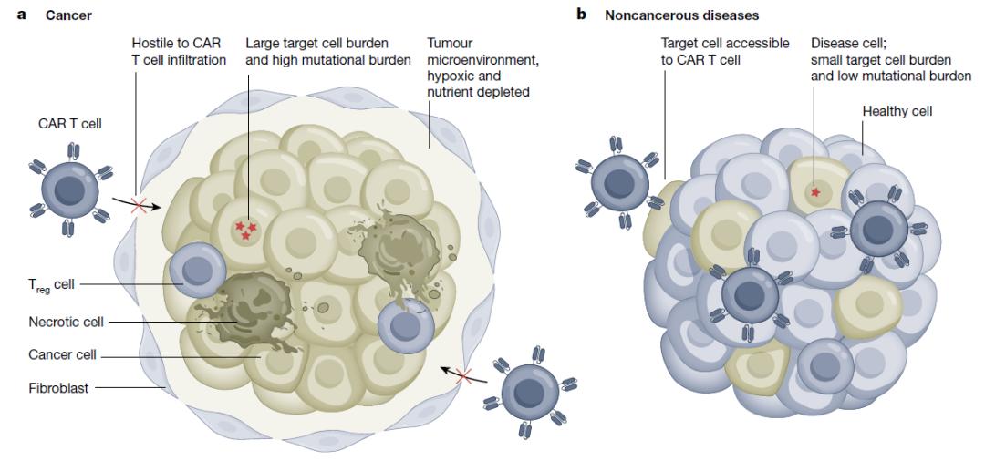 CAR-T细胞在实体瘤中面临的许多挑战,在非癌性环境中并不那么明显。例如,肿瘤细胞负荷通常很大,需要大量CAR-T细胞输注,这与高水平的细胞毒性、细胞因子风暴风险增加以及由于CAR-T细胞运输的可能性增加而导致的on-target、off tumour毒性相关。相比之下,非癌症疾病的靶细胞数量明显较低,此外,在癌症中,需要100%清除肿瘤细胞以防止复发,而在其他疾病中,部分清除病理细胞就具有治疗效果。癌细胞经常携带高突变负担,驱动基因组异质性,导致抗原逃逸,相比之下,大多数慢性疾病的突变负荷和遗传异质性相对较低。肿瘤微环境(TME)对是CAR-T细胞来说是一个实质性物理屏障,而大多数非癌性病变组织容易被CAR-T细胞接近和进入。而且,TME的免疫抑制环境在大多数慢性疾病中也不存在。