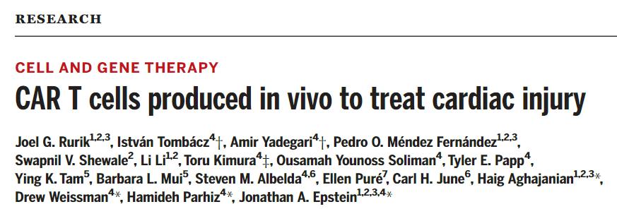 2022年1月,宾夕法尼亚大学佩雷尔曼医学院的研究人员在 Science 期刊发表论文【6】,该研究开发了一种在体内生成的瞬时工程化CAR-T细胞疗法,通过注射脂质纳米颗粒(LNP)递送的mRNA,重编程T细胞,使其识别心肌纤维化细胞,进而减少纤维化,恢复心力衰竭小鼠模型的心脏功能。