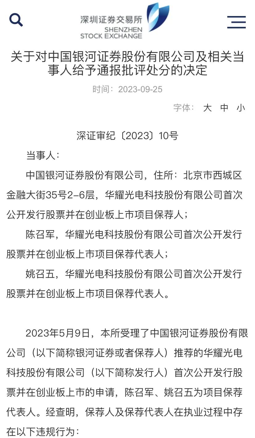 9月25日,深交所公布多则罚单,事涉华耀光电IPO项目。保荐机构银河证券,保荐代表陈召军、姚召五,法律服务机构北京君合律师事务所,签字律师石铁军、刘鑫均被监管点名。