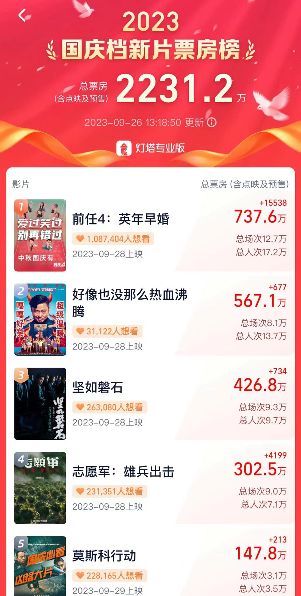 爱情电影《前任4:英年早婚》超700万的预售成绩,目前呈现出绝对的领先优势。9月28日当天的第二、三名《坚如磐石》《志愿军》,同为国庆档主打类型主旋律影片,两者预售成绩也十分相近。另一部大片刘德华、张涵予主演的《莫斯科行动》选择在9月29日,也就是中秋国庆假期第一天上映,目前首日预售也已突破百万。