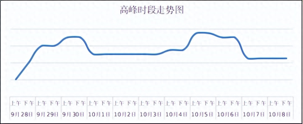 预计从9月28日(假期前一天)下午2时开始流量增长持续至晚8时,晚10时至29日2时,受零时开始免费影响,部分路段出现短时缓行情况;29日(假期第一天)从早7时开始至晚8时分段出现车流高峰;30日(中秋后一天,假期第二天)预计会出现第二波次高峰;1日至4日流量较日常高位运行,5日至6日为返程高峰,返程高峰时间从早7时至晚10时,间断出现高峰。7日和8日(假期结束后两天为周末)仍可能会出现车流小高峰。