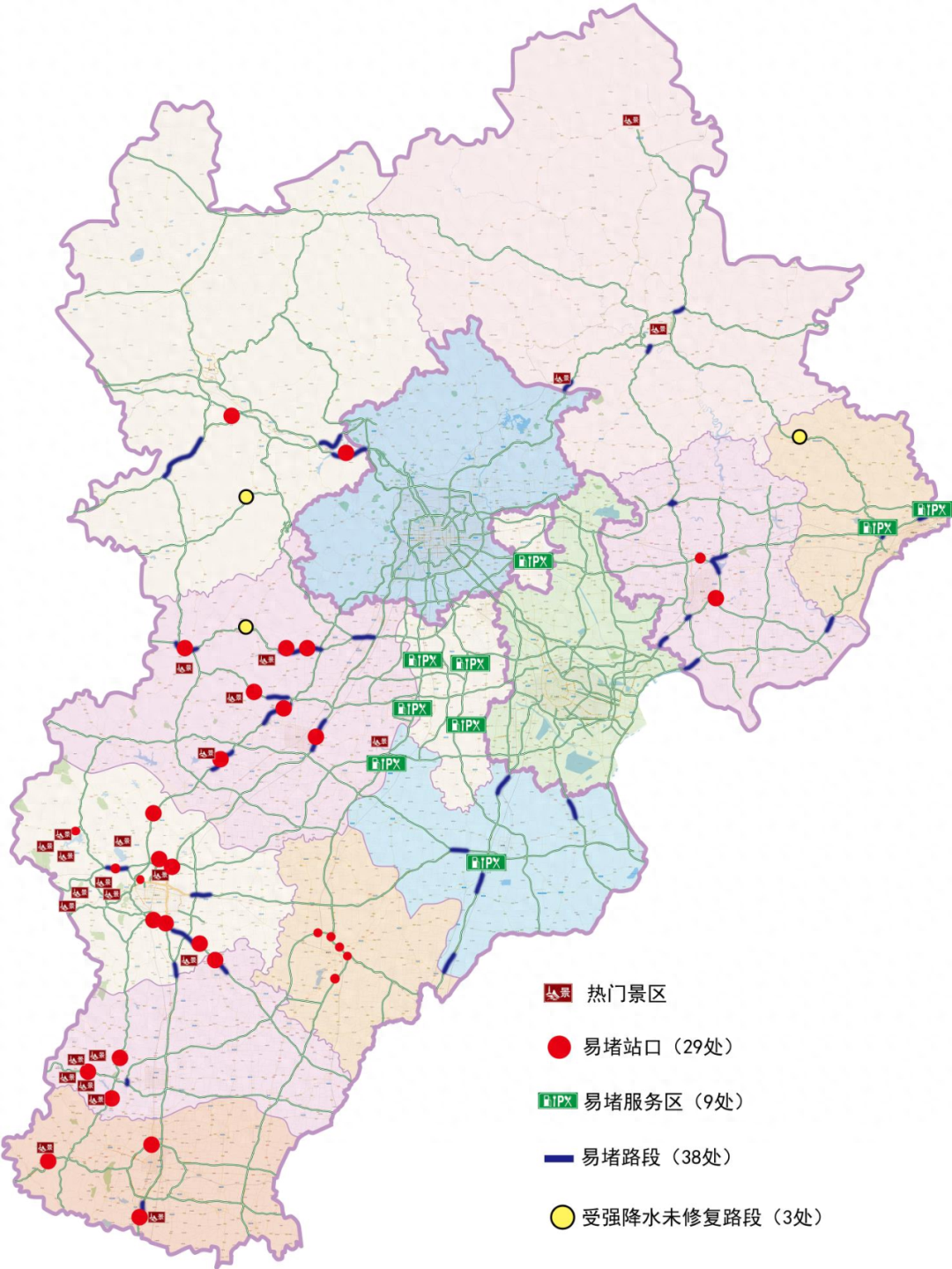 预判易堵路段38处,易堵站口29处,易堵服务区9处,受强降水未修复路段3处。