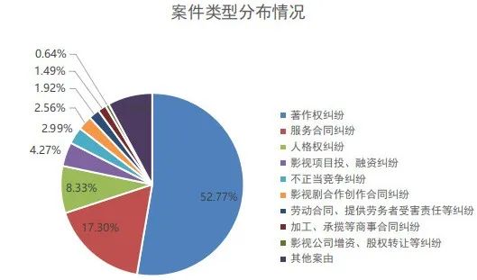 白皮书显示,2021年1月至2023年6月,松江区人民法院共受理涉影视产业案件468件。主要集中在著作权纠纷,服务合同纠纷,人格权纠纷,影视项目投、融资纠纷,不正当竞争纠纷,影视剧合作创作合同纠纷等。其中著作权纠纷占比最高,达到52.77%。以调解、撤诉方式结案案件329件,占审结案件的73.43%。这反映出在影视产业领域进行矛盾纠纷多元化解大有可为。
