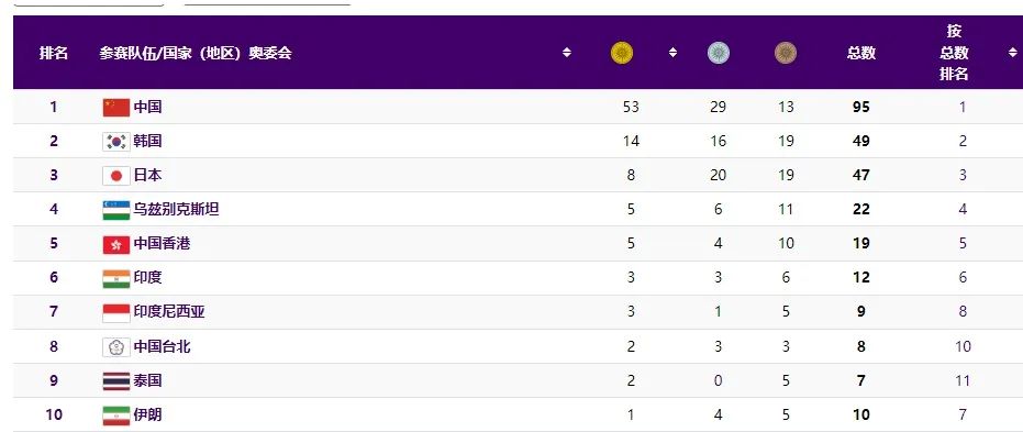 中国队累计获得53金29银13铜