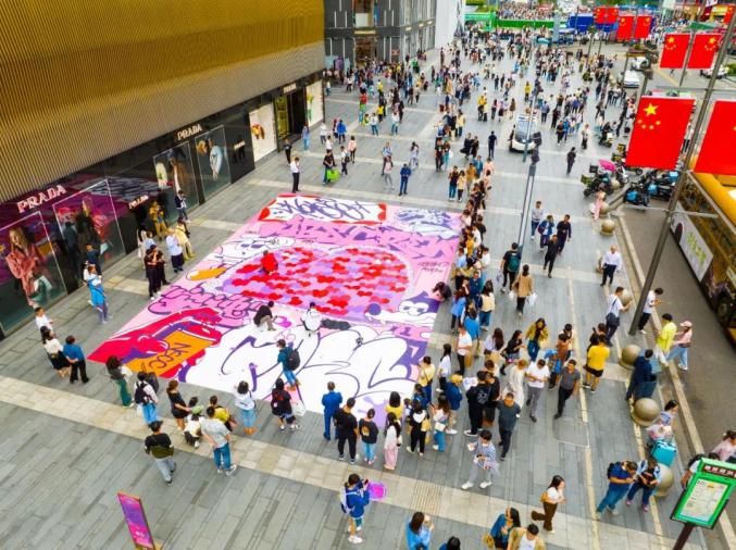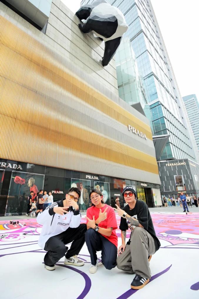 此外,神山隆二与国内先锋涂鸦艺术家ABS-NOISE、NSC-GOES携手,以地为纸,融合具有城市特色元素的符号,于成都IFS大型户外艺术装置大熊猫——I AM HERE下共创出一幅巨幅涂鸦作品,即日起至10月15日对公众展出。
