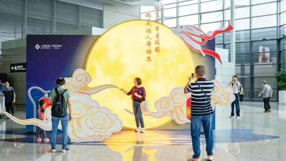 虹桥机场在2号航站楼设置了以明月、灯笼和玉兔为元素的打卡背景墙供旅客拍照留念。受访者 供图