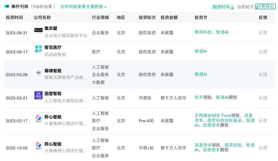 来源:烯牛数据其中,智谱AI更是连续参与了聆心智能的两轮融资:2022年12月,聆心智能完成数千万元天使+轮融资,由连星资本领投,图灵创投和智谱AI跟投;短短三个月后,聆心智能完成Pre-A轮融资,由SEE Fund领投,老股东超额跟投。