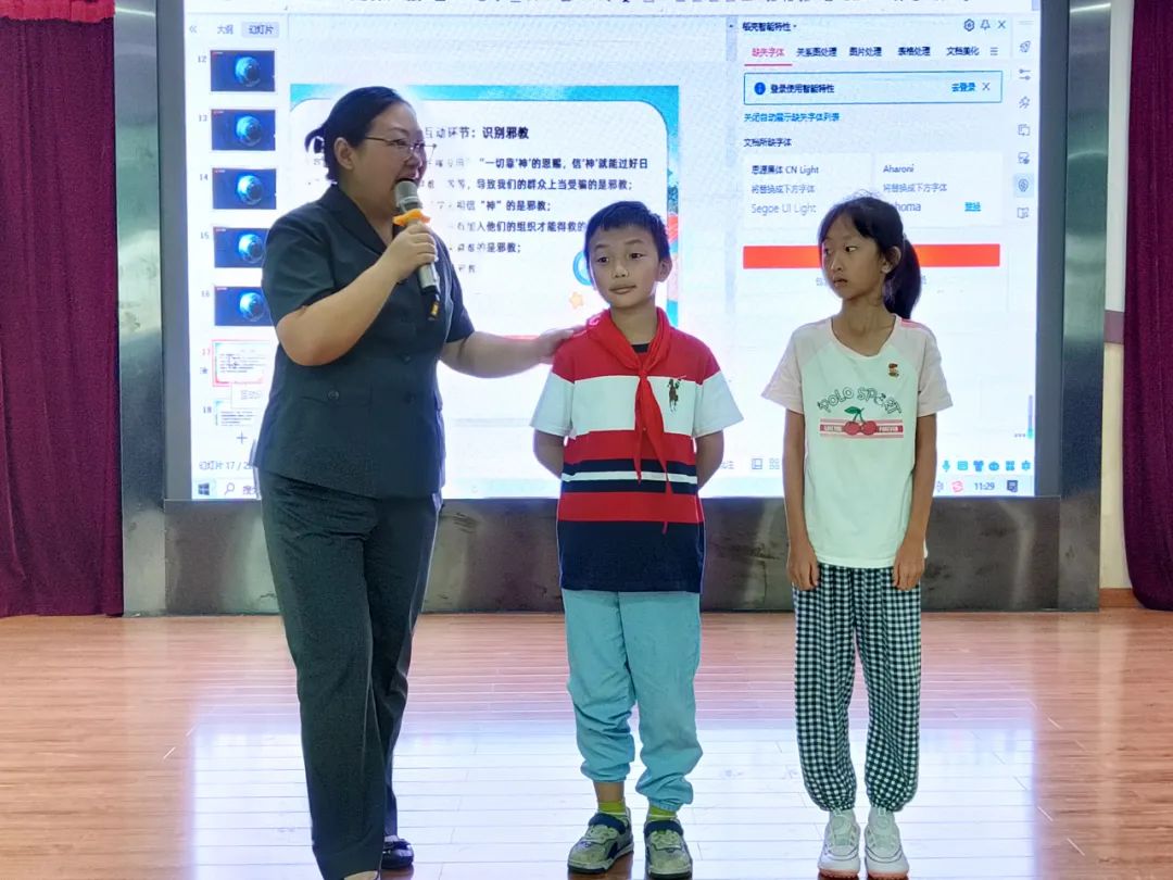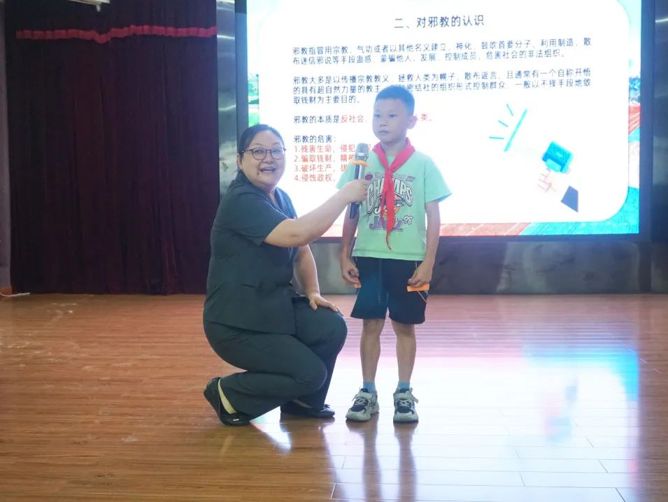 在互动环节,学生们竞相走上讲台,主动分享自己的感言,“我们一定不要相信那些吹嘘自己法力无边、神通广大的'活神仙'的话。”“在爸妈或老师不在身边时,不要轻易和陌生人说话,不要跟陌生人走。”“不要相信包治百病的骗人话,生病了要吃药,不要相信念念咒语就会好。”“发现有人散发邪教宣传品,要及时向学校、公安机关举报。”活动现场,学生们听得认真、看得专注、发言踊跃。