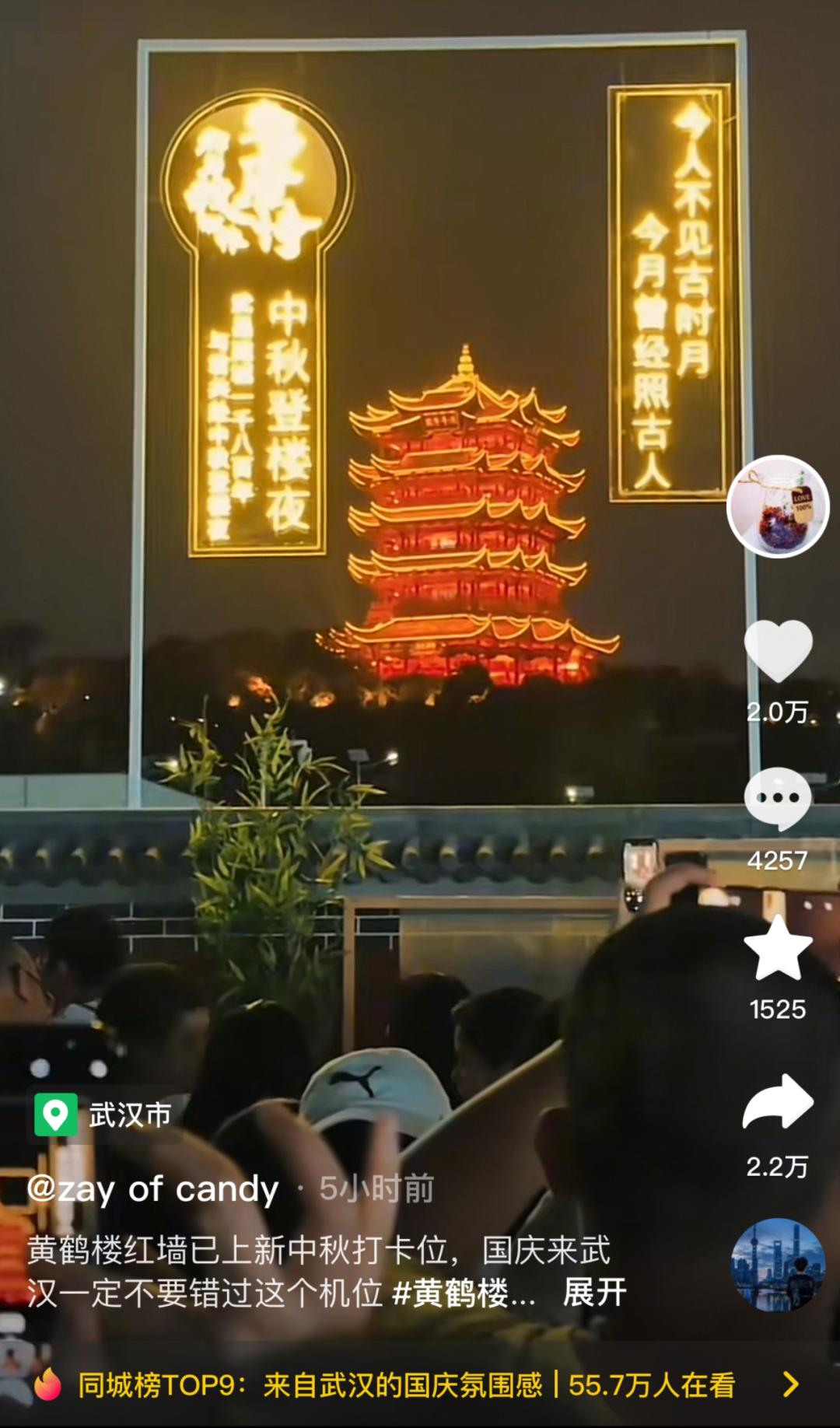 也正是因为诗歌的抢镜衬托,一定程度上使得这个打卡地标吸引了众人。翻阅抖音、小红书、B站等平台,细心留意,就会发现在中秋的氛围中,存在着这样一处奇妙场景。武汉可以说是一座与唐诗有深厚渊源的城市,崔颢《黄鹤楼》的一句“昔人已乘黄鹤去,此空余黄鹤楼”,李白《黄鹤楼送孟浩然之广陵》的一句“故人西辞黄鹤楼,烟花三月下扬州”,都是名传千古的唐诗佳作。
