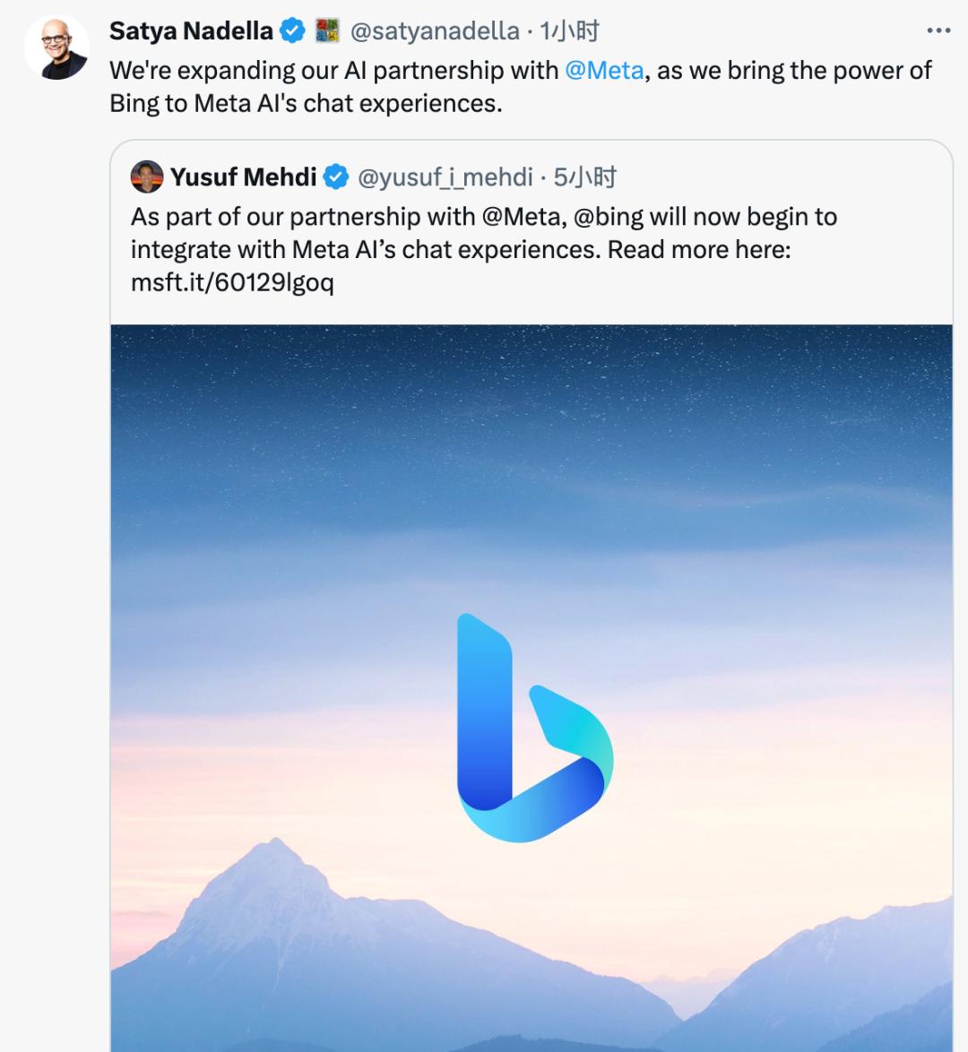 微软 CEO 纳德拉分享微软与 Meta 合作的消息微软副总裁兼消费者首席营销官 Yusuf Mehdi 介绍了双方的合作。他表示,微软与 Meta 合作,将必应集成到 Meta AI 的聊天体验中,通过访问实时搜索信息来提供更即时、最新的答案。我们来看扎克伯格在现场的演示。