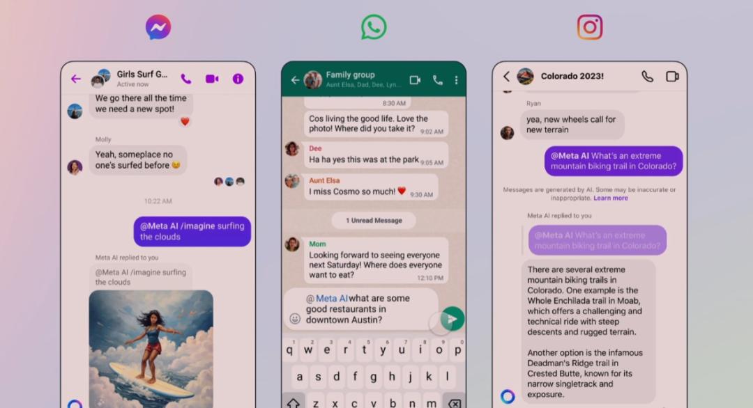 除了 Meta AI 聊天机器人,必应还将集成到 Meta 的其他产品,比如在 WhatsApp、Messenger 和 Instagram 中发送消息。