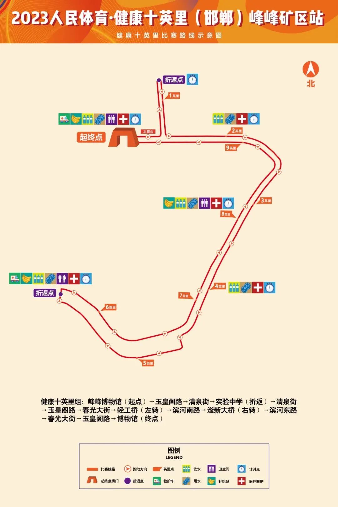 健康十英里峰峰博物馆(起点)→玉皇阁路→清泉街→实验中学(折返)→清泉街→玉皇阁路→春光大街→轻工桥(左转)→滨河南路→滏新大桥(右转)→滨河东路→春光大街→玉皇阁路→博物馆(终点)