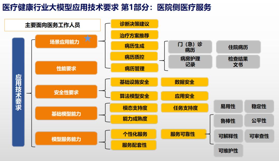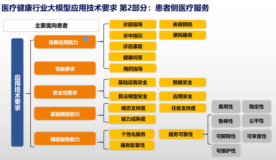 根据专家建议及编写组成员单位修改意见,中国信息通信研究院针对大模型开展医疗服务的医院端及患者端,围绕场景应用能力、性能要求、安全性要求、基础模型能力、模型服务能力等方面,进一步完善了技术要求内涵。