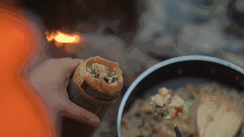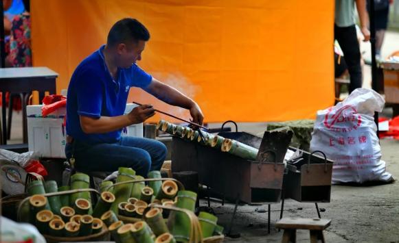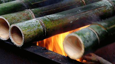 将湿米、香菇、猪肉、干菜之类的塞入竹筒之中,再用木塞封住凿口放到火堆上烤。等到竹筒碳烤至略微发黑,里面的米饭就熟了,用刀把竹筒劈开,一股香气飘出,惹得人口水直流。