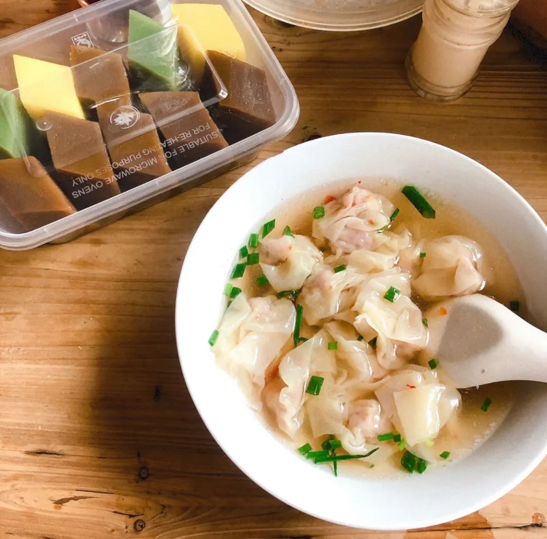 这种薄皮馅嫩的馄饨,不用煮太久,基本烫几秒就熟。捞起装进一碗葱花汤里,肉馅饱满,白里透红,样子好,味道更好。