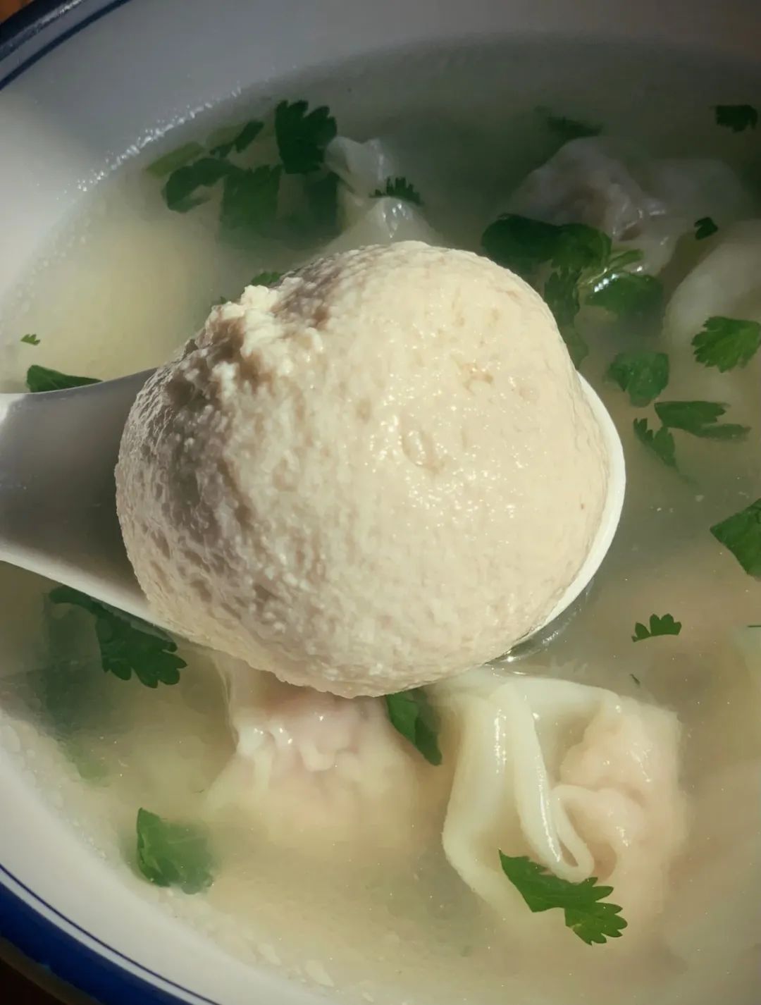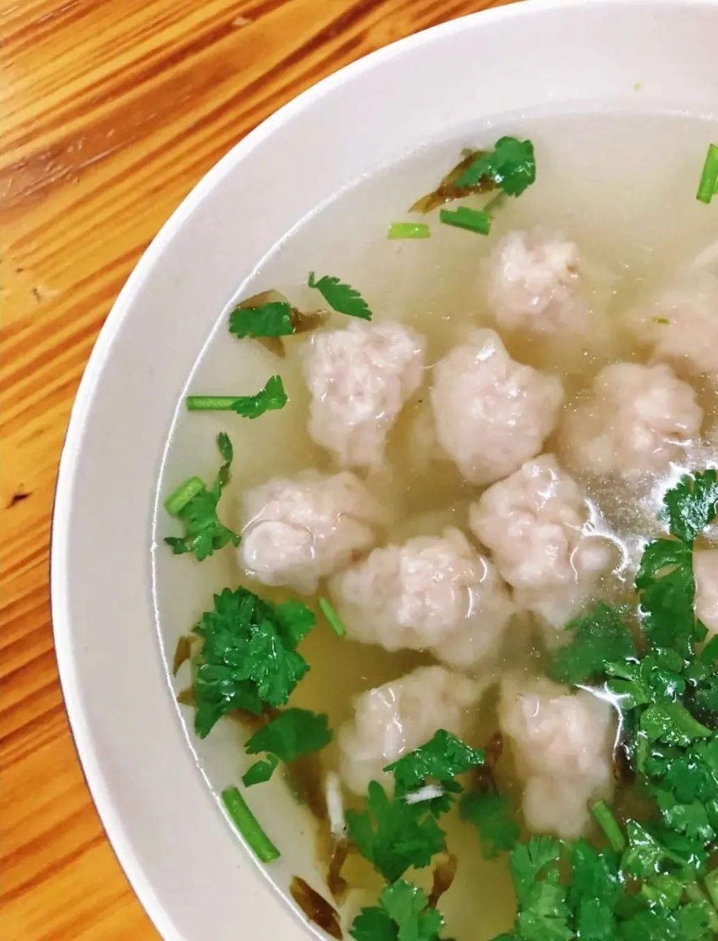 豆腐圆可油炸也可做汤,当地人习惯汤吃,豆腐细嫩滑软,味道鲜美,汤里的猪油香和内里的肉馅平衡了豆腐的寡淡,最后再撒上香菜葱花做点缀,齐活!