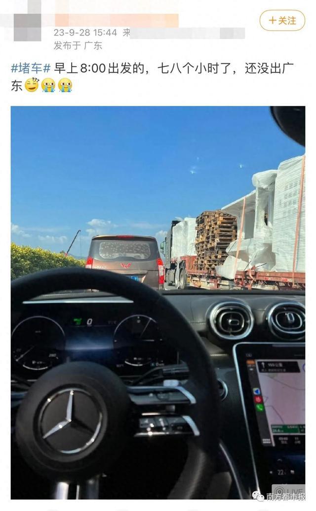 另据广州广播电视台,9月28日广东高速公路迎来出行高峰期,一名从东莞回老家衡阳过节的车主称,她特意选择凌晨出行但是开了8小时仍未出广东。
