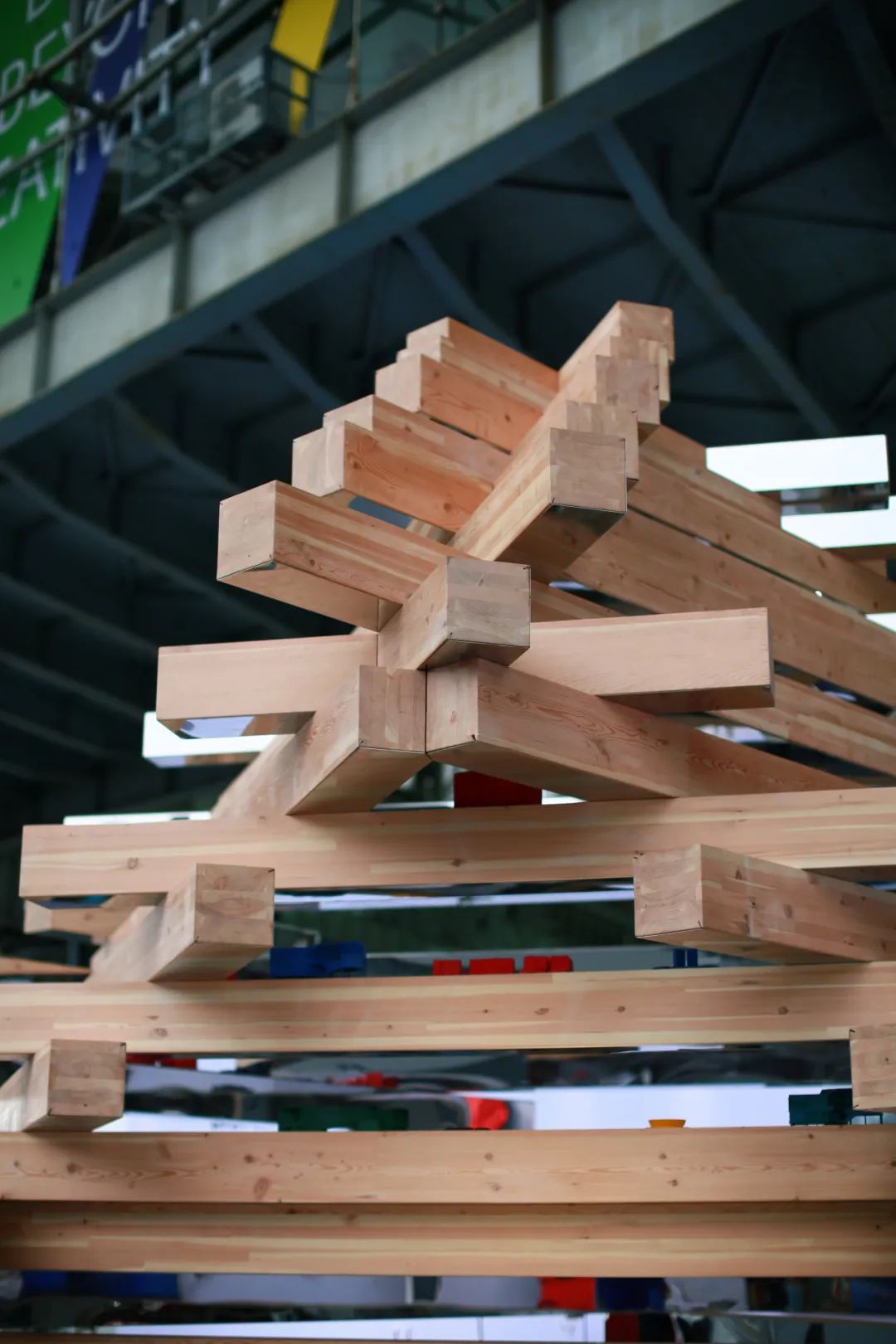亭台楼阁、雕梁画栋,对木材建起的生态、结构美学的向往深深根植在我们的文化基因之中。综合考虑加工工艺、结构受力、使用年限等因素,此次选择0.19×0.19米的胶合木梁作为主材搭建总高约5米的“设计之构”,旨在耐久、安稳的表达自然柔情,洞见传统材料的时代机遇。