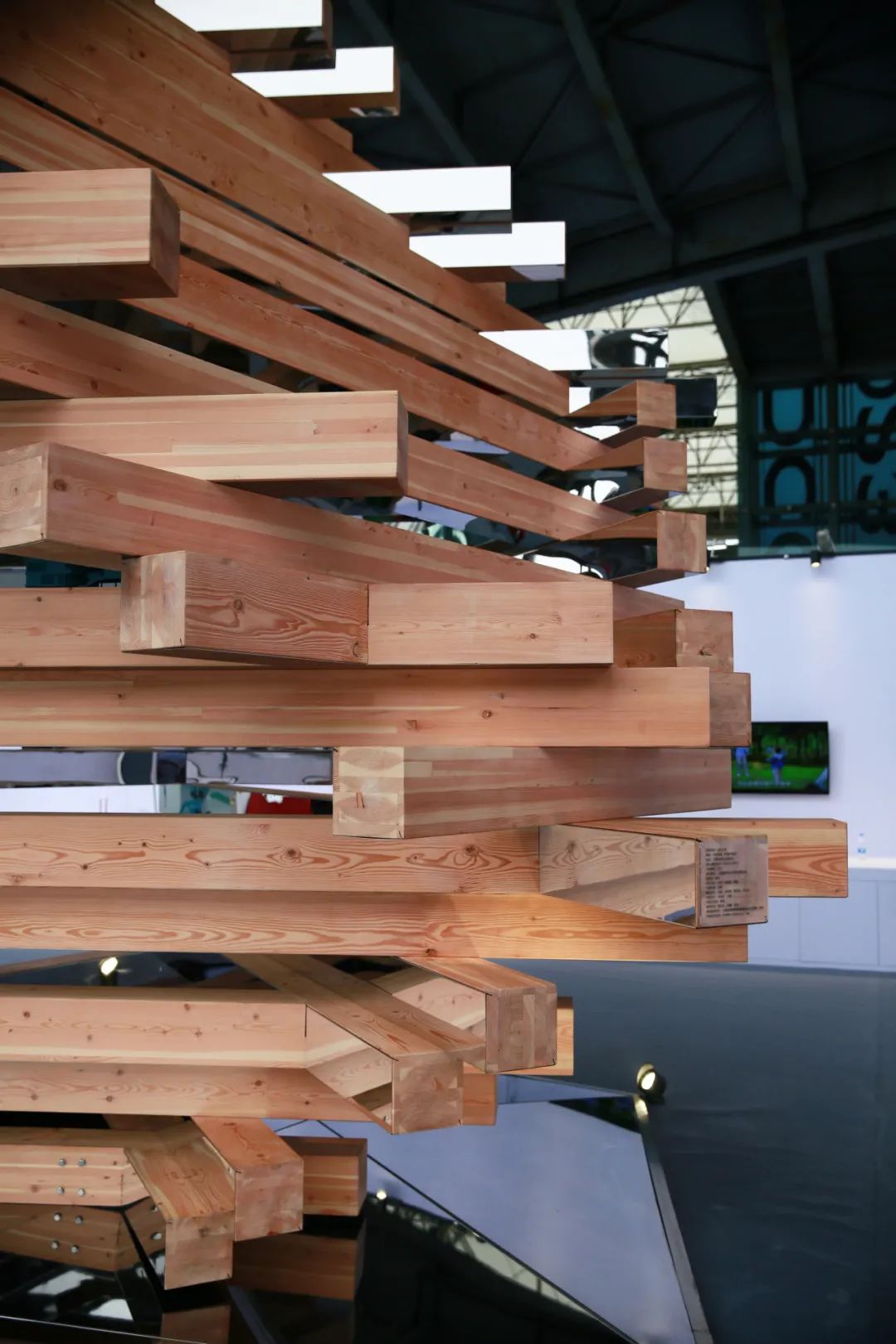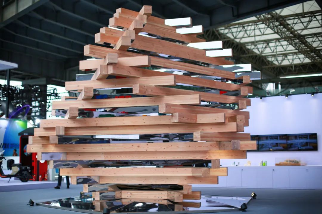 装置以 4.5×4.5×4.5 米的立方体为原型,旋转至对角线垂直于地坪,底部三根木条相互咬合,螺旋向上、榫卯搭接,直至形成立方体完型,以“三生万物”之势呼应大会“造化万象”之愿景。