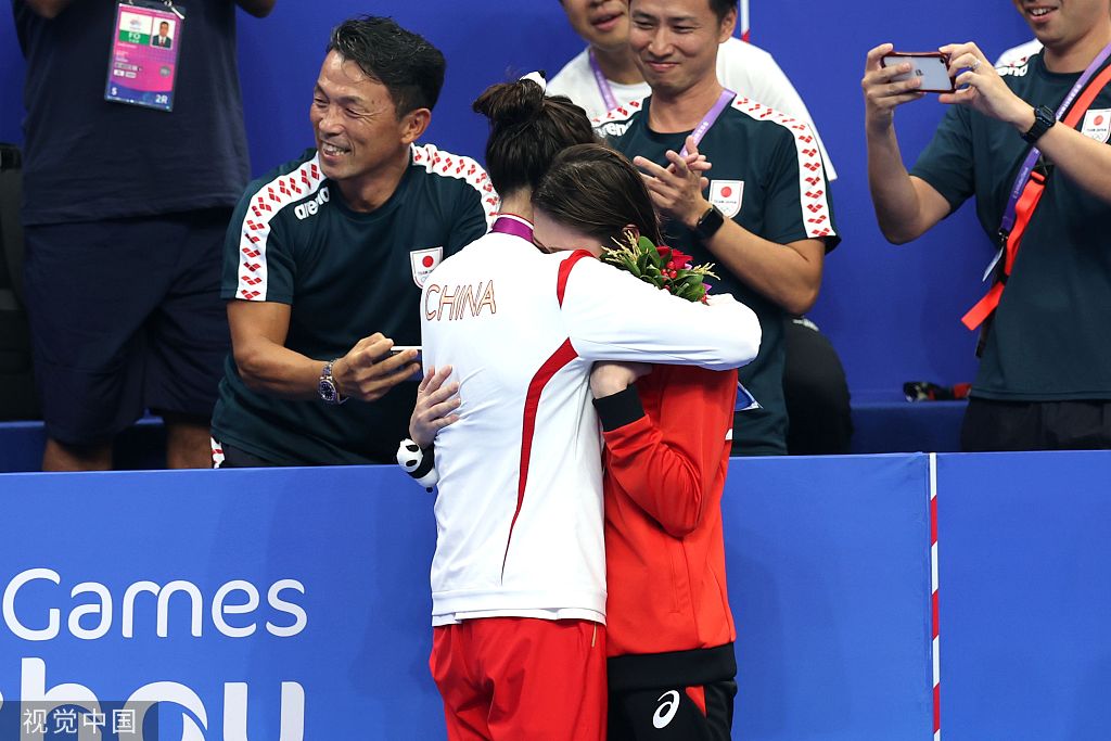 张雨霏和日本选手池江璃花子赛后相拥而泣。
