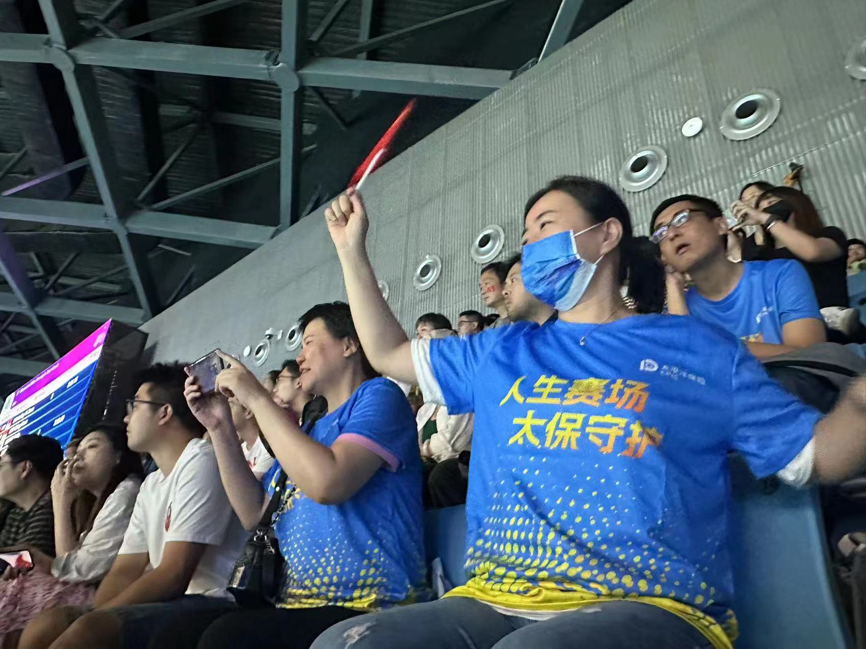 游泳比赛最后一天,中国太保也组织了亚运观赛团,现场为运动员加油。