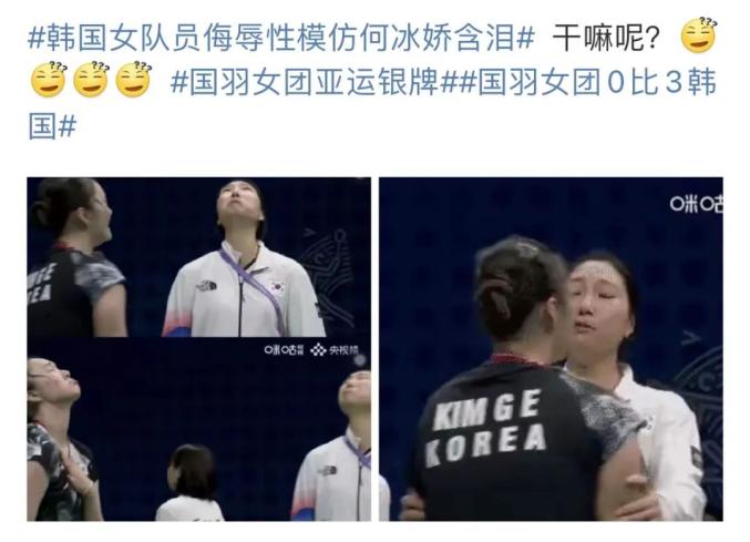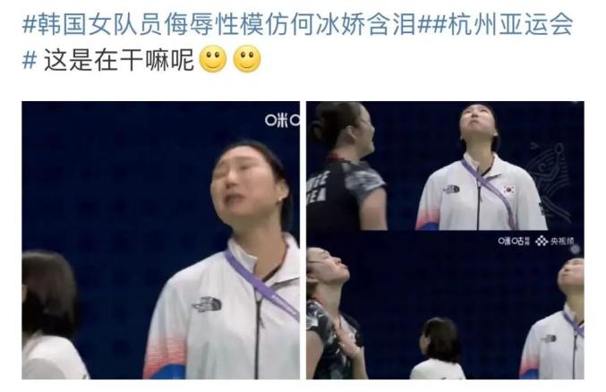 随后,韩国女队员金佳恩和教练成池铉疑似侮辱性模仿何冰娇含泪,引起网友关注,相关话题冲上微博热搜。