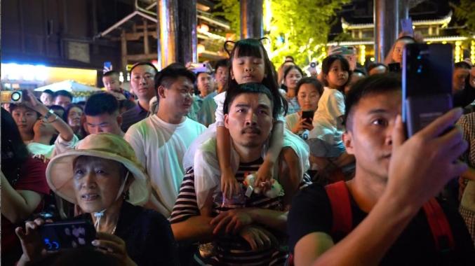 除了璀璨绚烂的烟火秀,在小镇剧场里,中央民族乐团通过丰富多彩的民族音乐表现形式,展现恢宏的国乐气派,为观众带来一场震撼人心的视听盛宴。剧场外,人流熙攘,烟火升腾,美食一条街上的特色烧烤鱼、烤肉串、苗家腊味、冰粉等各式小吃琳琅满目、香味扑鼻,吸引群众驻足购买。摊主的吆喝声、群众的欢笑声交织成一幅热闹繁华、活力勃发的夜生活画卷。