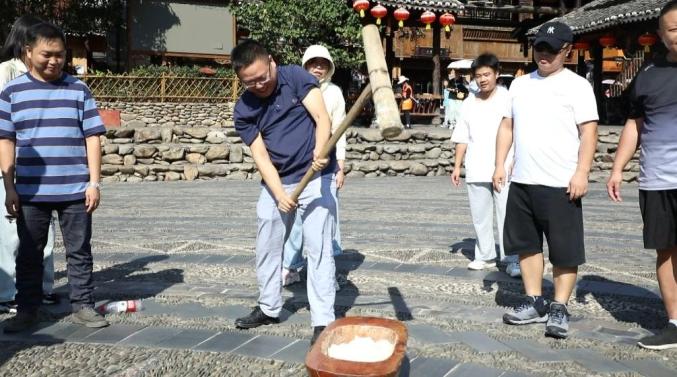 在苗寨,糍粑象征着丰收与团圆。原生态民族歌舞表演结束后,精彩有趣的打糍粑比赛正式开始。现场工作人员将蒸好的糯米倒入木槽,报名参赛的游客被分为两组,大家你锤几下我打一会儿,在接力比赛中轮流体验着打糍粑的乐趣。现场欢笑声、喝彩声、加油声此起彼伏,将节日的氛围推向了高潮。
