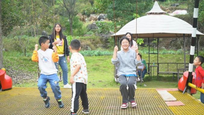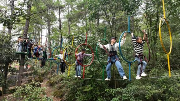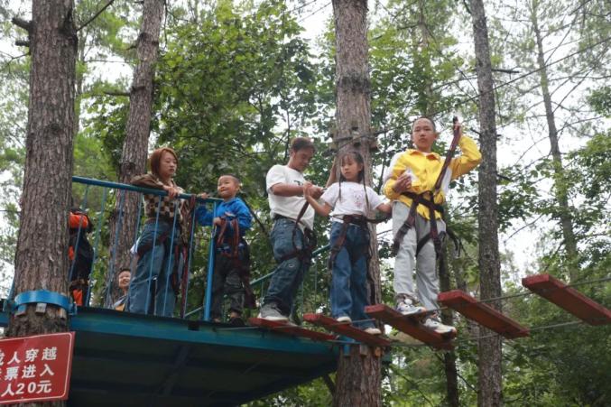 “我今天来这里玩了一下丛林穿越,觉得这里很好玩、很有趣,玩起来也很刺激,可以带小孩来这里体验一下。”刚刚解开安全扣的胡先生一脸兴奋地说。木召生态旅游度假景区是国家AAA级旅游景区,以亲子研学自驾游营地为主题,内设有丛林穿越、恐龙园、真人CS、瀑布秋千等项目。在中秋、国庆来临之际,吸引了大批带孩子前来体验的游客。