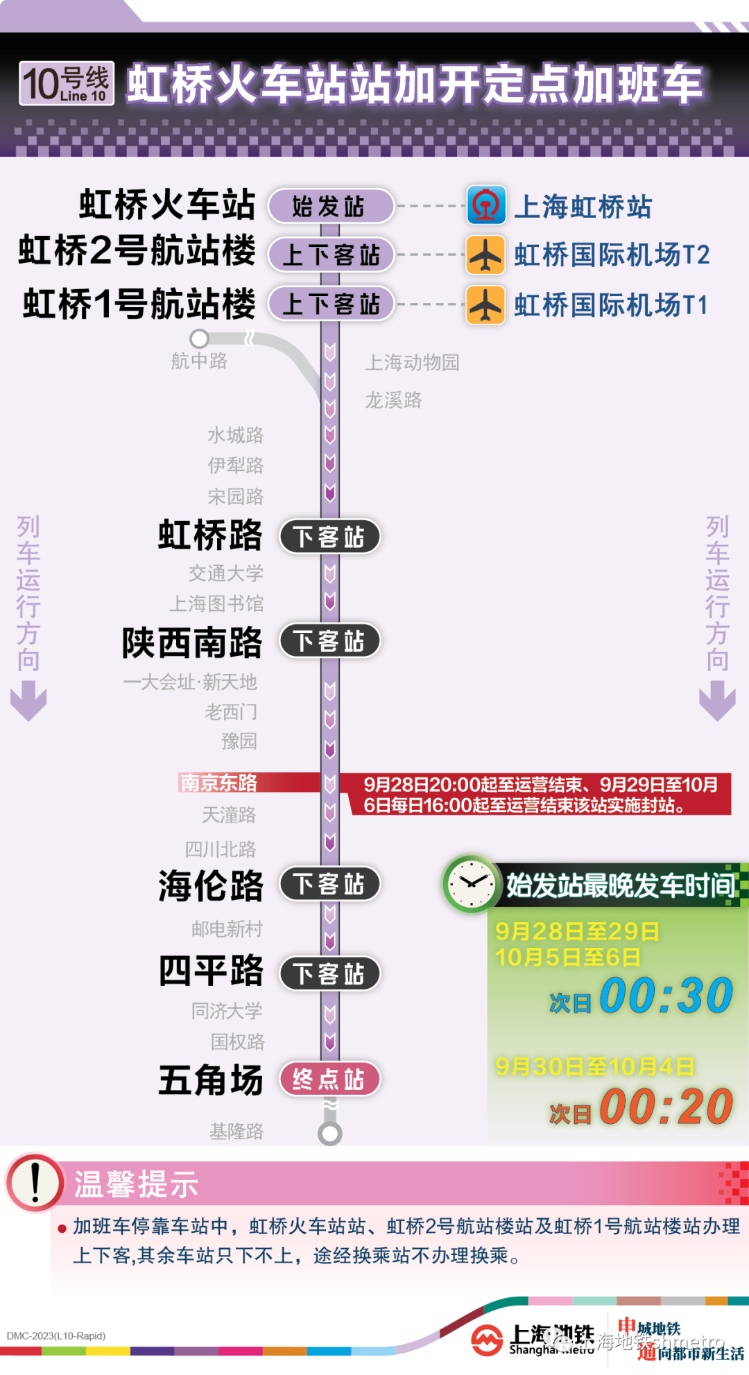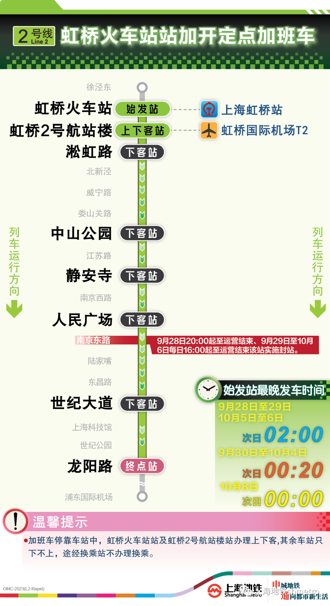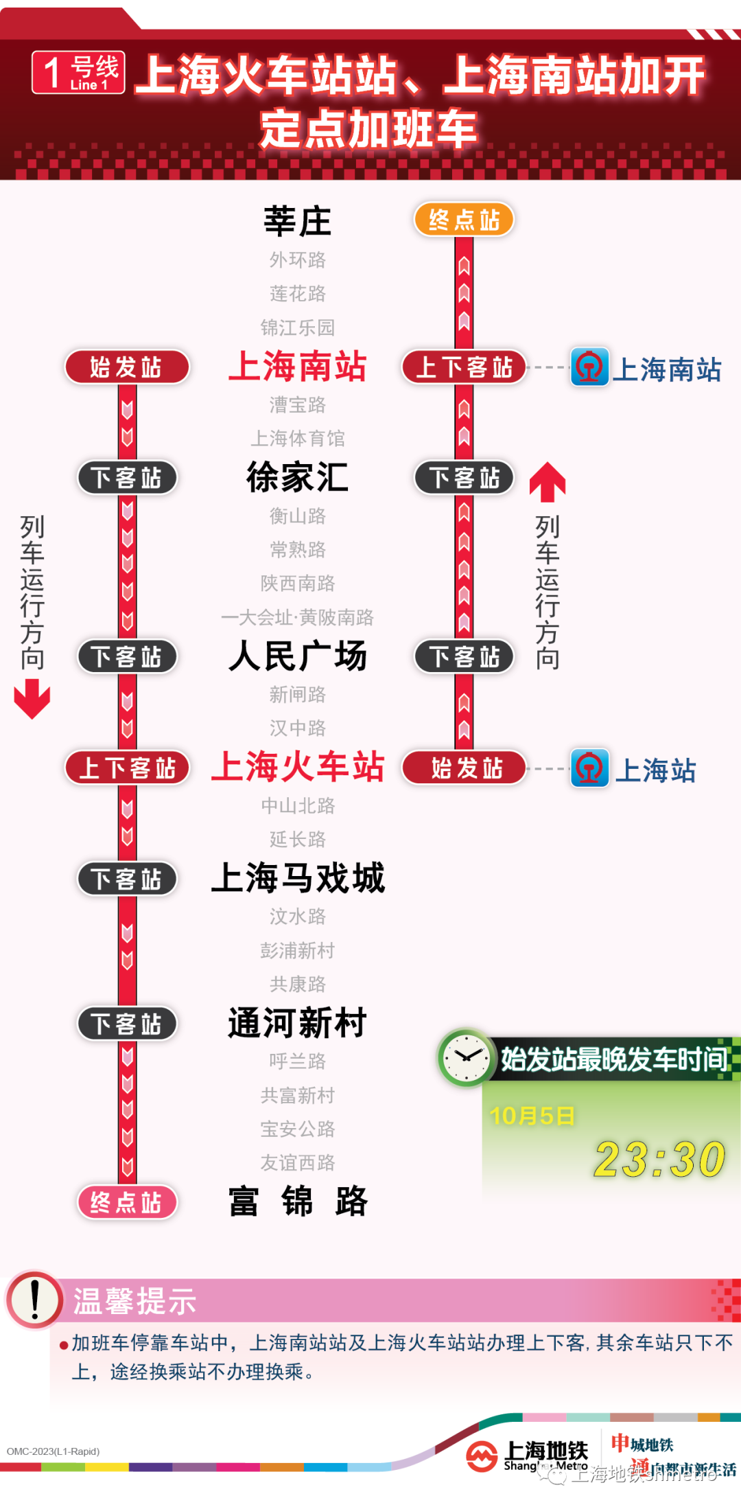 此外为做好节假日返程期间上海火车站、虹桥火车站、上海南站的夜间客流疏散工作,10月5日,地铁1号线在图定基础上实施定点加开方案,加开末班车发车时间至23:30;另10月8日地铁2号线增加定点加班车班次,加开末班车发车时间至次日0:00。