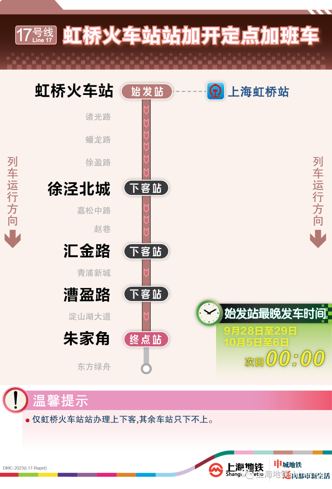 根据铁路虹桥站夜间到达列车开行情况,9月28日、9月29日、10月5日、10月6日,铁路在原夜间图定计划的基础上增加了开行班次。为应对铁路临时加开,做好虹桥火车站夜间列车集中到达大客流疏散工作,虹桥枢纽相关的地铁2、10、17号线在既定延时或加开方案的基础上进一步增开定点加班车。其中,9月28日至29日、10月5日至6日夜间,虹桥火车站定点加班车最晚发车时刻为:2号线至次日2:00、10号线至次日0:30、17号线至次日0:00。同时,9月30日至10月4日,2号线和10号线虹桥火车站定点加班车发车时刻推迟至次日0:20。