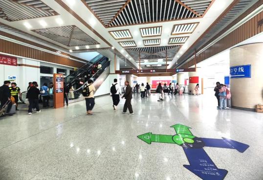 二、旅客进站、出站以及接站须知:1、乘坐机动车进站的旅客,请于地下停车场“落客区”下车,乘坐扶梯直达地面一层安检大厅(进站口)和售票大厅;步行进站旅客,请按照交通规则文明出行,在地面步行进站。