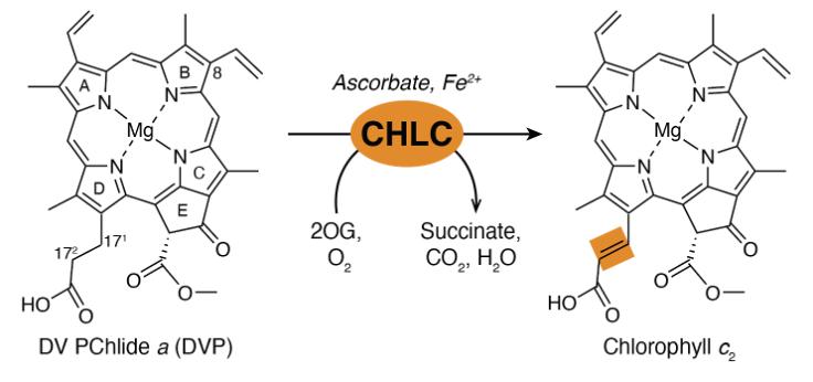 叶绿素c合成反应示意图。CHLC蛋白利用一系列辅因子在底物(DVP)侧链上形成碳碳双键尾声:这意味着什么?