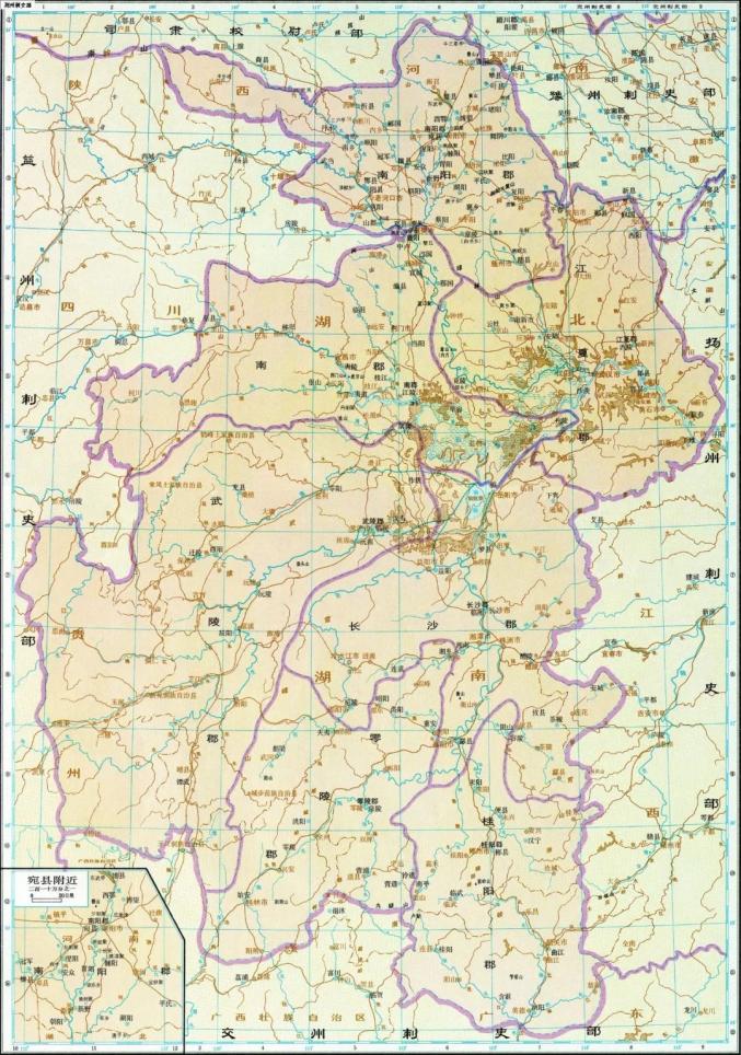 三国时的荆州,下辖长沙、零陵、桂阳、南阳、江夏、南郡等八郡,辖境大致上是今湖北、湖南二省及河南、贵州、广西、广东等省部分地区。