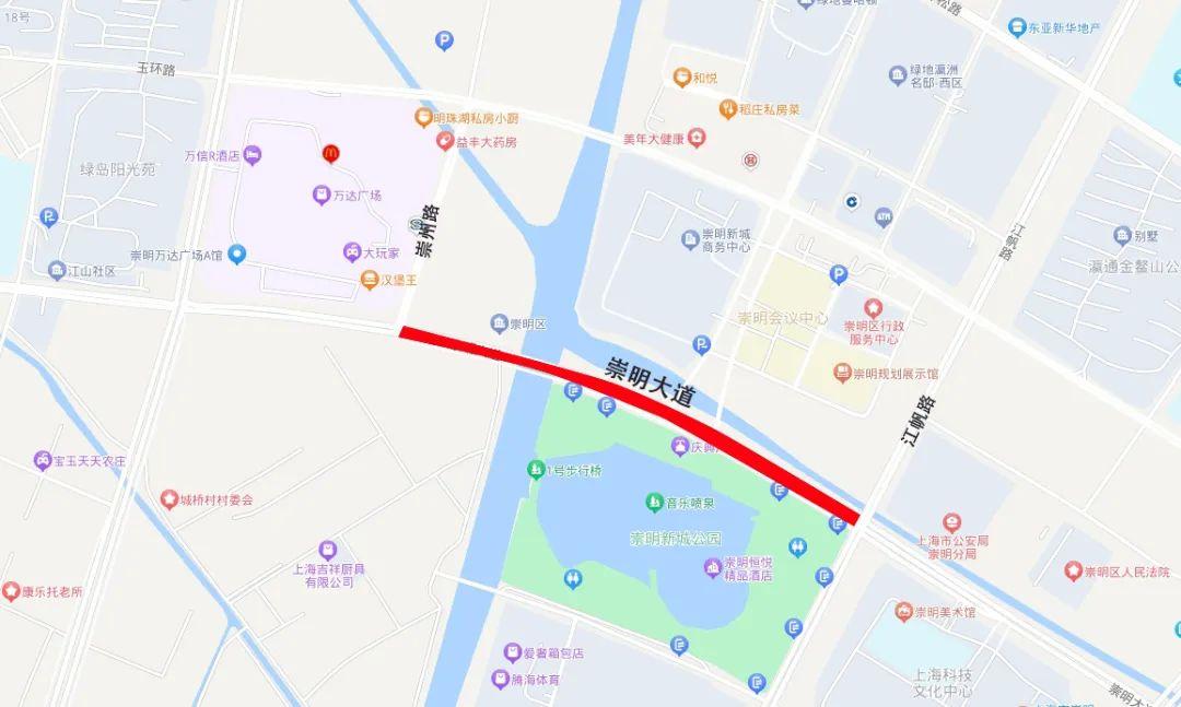 崇明大道(江帆路至崇州路)实施双向交通管制措施,禁止一切车辆通行。