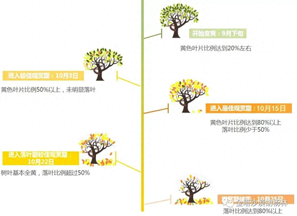 依据经验,胡杨林每年9月10日左右开始有局部黄叶,9月20日左右有将近三分之一的林子变黄,最佳观赏时间为9月25日—10月25日,这时候林子多数是黄色的。如果天气稳定,黄叶可以持续到11月初。