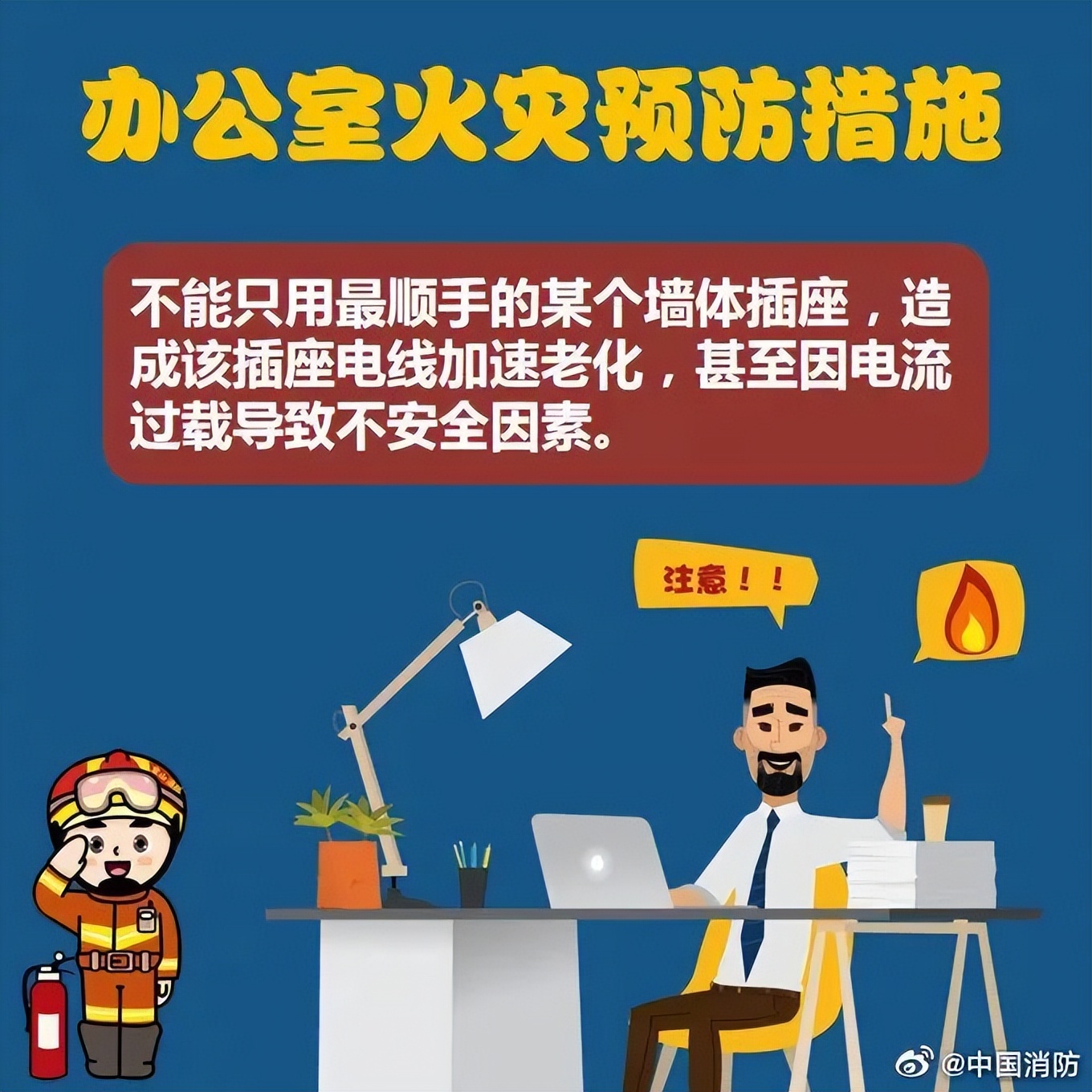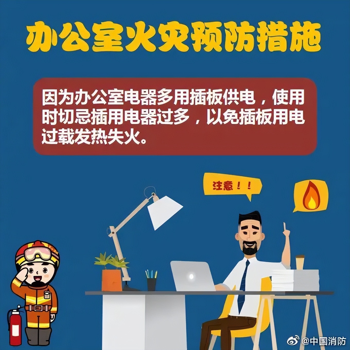 办公室存在大量电器,如空调、饮水机、电脑、打印机等,容易出现私拉乱接电线和将多个大功率电器插在一个插线板上的现象,都极易引起线路发热,继而导致起火。