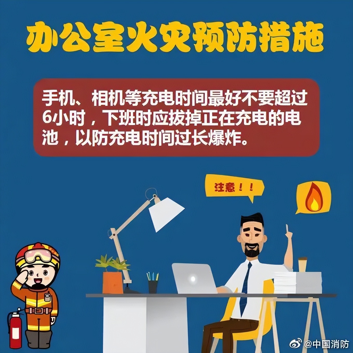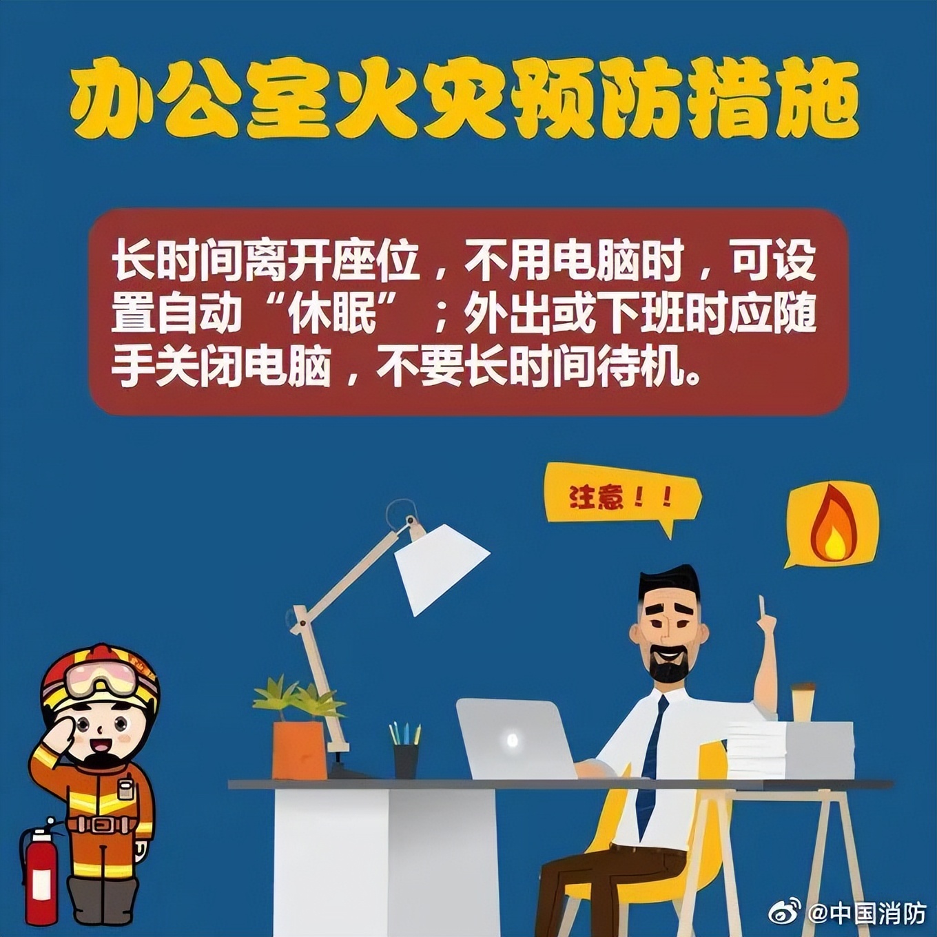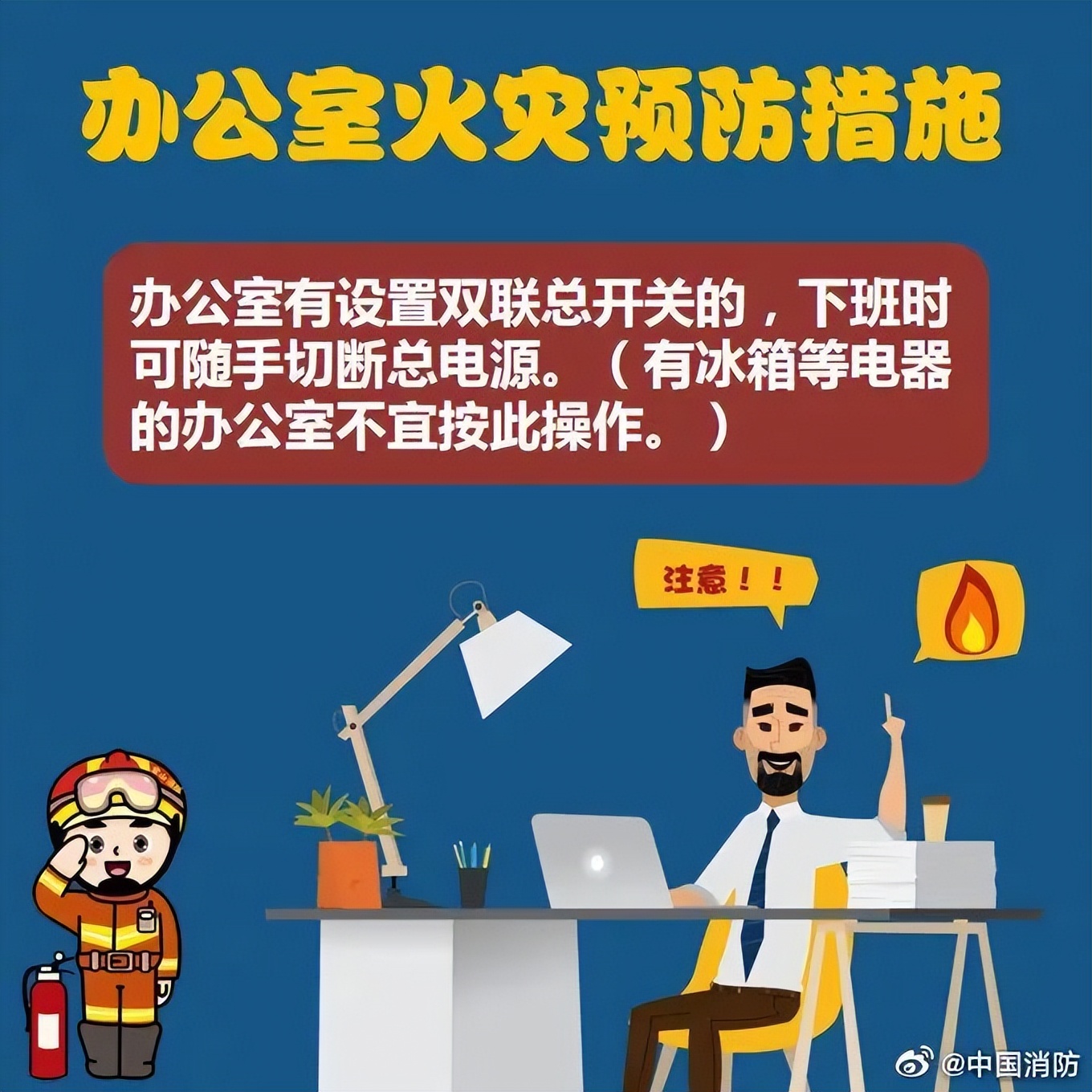 2023年3月,湖北省恩施市某大厦办公室发生火灾,消防部门扑救及时,未造成人员伤亡。起火原因是工作人员未断开电源,插线板电器线路故障引燃周围可燃物。