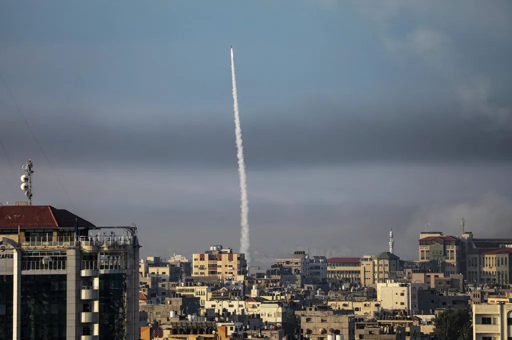 当地时间10月7日,加沙城,火箭弹射向以色列。巴勒斯坦伊斯兰抵抗运动(哈马斯)宣布,对以色列展开新一轮名为“阿克萨洪水”(Al-Aqsa Flood)的军事行动。哈马斯方面表示,在新的军事行动中,已发射数千枚火箭弹。