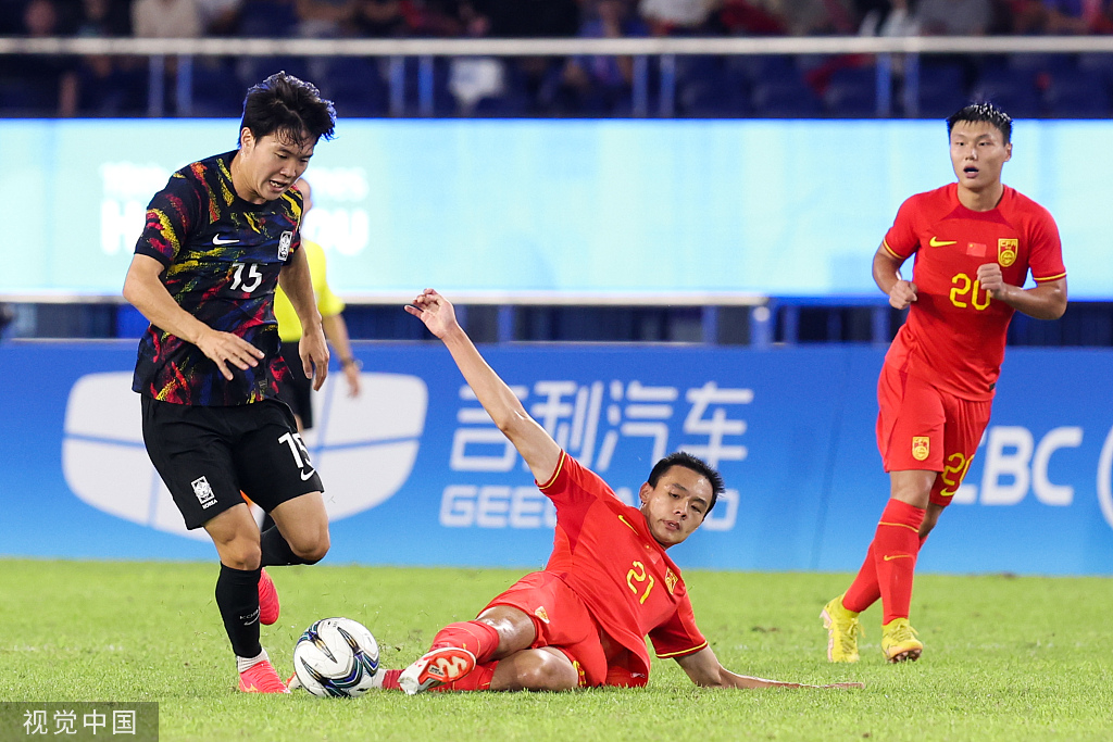 2023年10月1日,浙江杭州,杭州亚运会男足1/4决赛,中国0-2韩国。 视觉中国 图