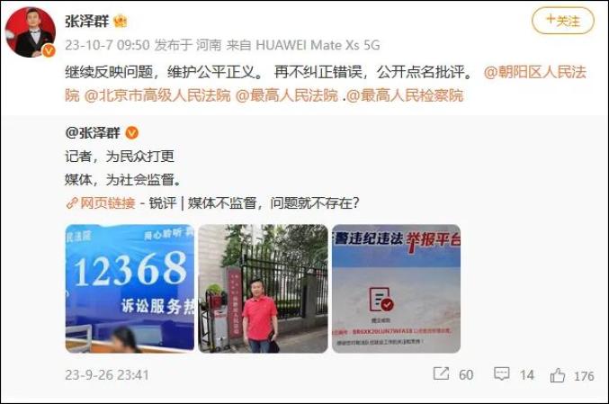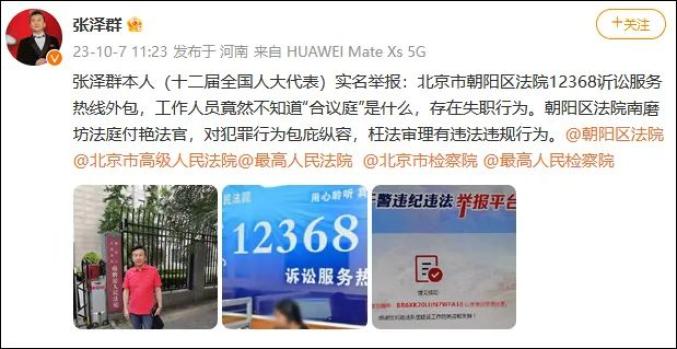 张泽群在评论区补充说,12368是诉讼热线,是司法体系的重要环节,不应是第三方呼叫中心该做的。朝阳区法院外包该司法工作,无法律意识,失职失察。张泽群10月7日早些时候还转发了其9月26日发布的“记者,为民众打更;媒体,为社会监督”微博,称“继续反映问题,维护公平正义。再不纠正错误,公开点名批评”。