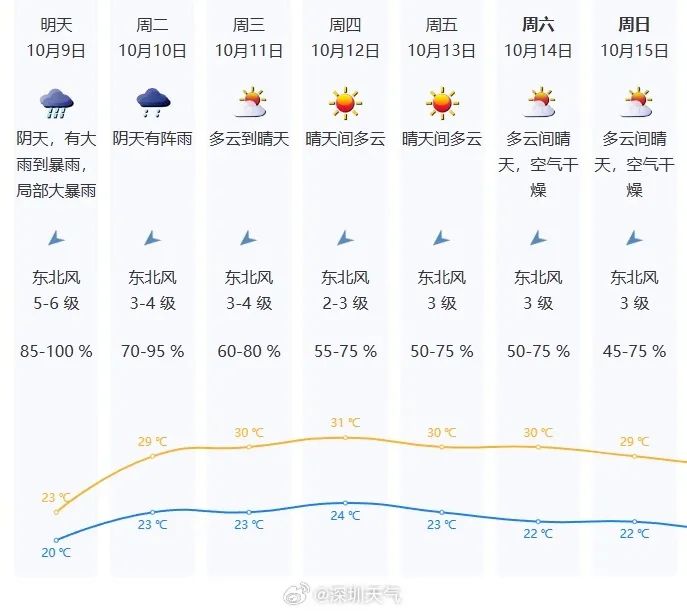 周一阴天,有大雨到暴雨,局部大暴雨,气温20-23℃,东北风5-6级,沿海、高地和海区最大阵风9-10级。