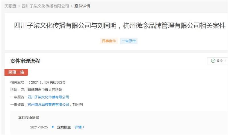 2021年,“李子柒” 起诉 “李子柒”。四川子柒文化传播有限公司,起诉杭州微念品牌管理有限公司、刘同明,经办法院为四川省绵阳市中级人民法院。