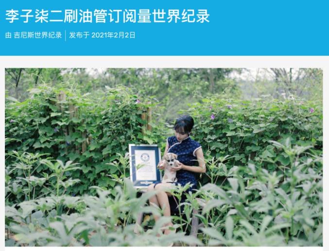 2020年,李子柒以1140万的油管订阅量,被录入《吉尼斯世界纪录大全2021》,一年以后,她就刷新了自己的世界记录。