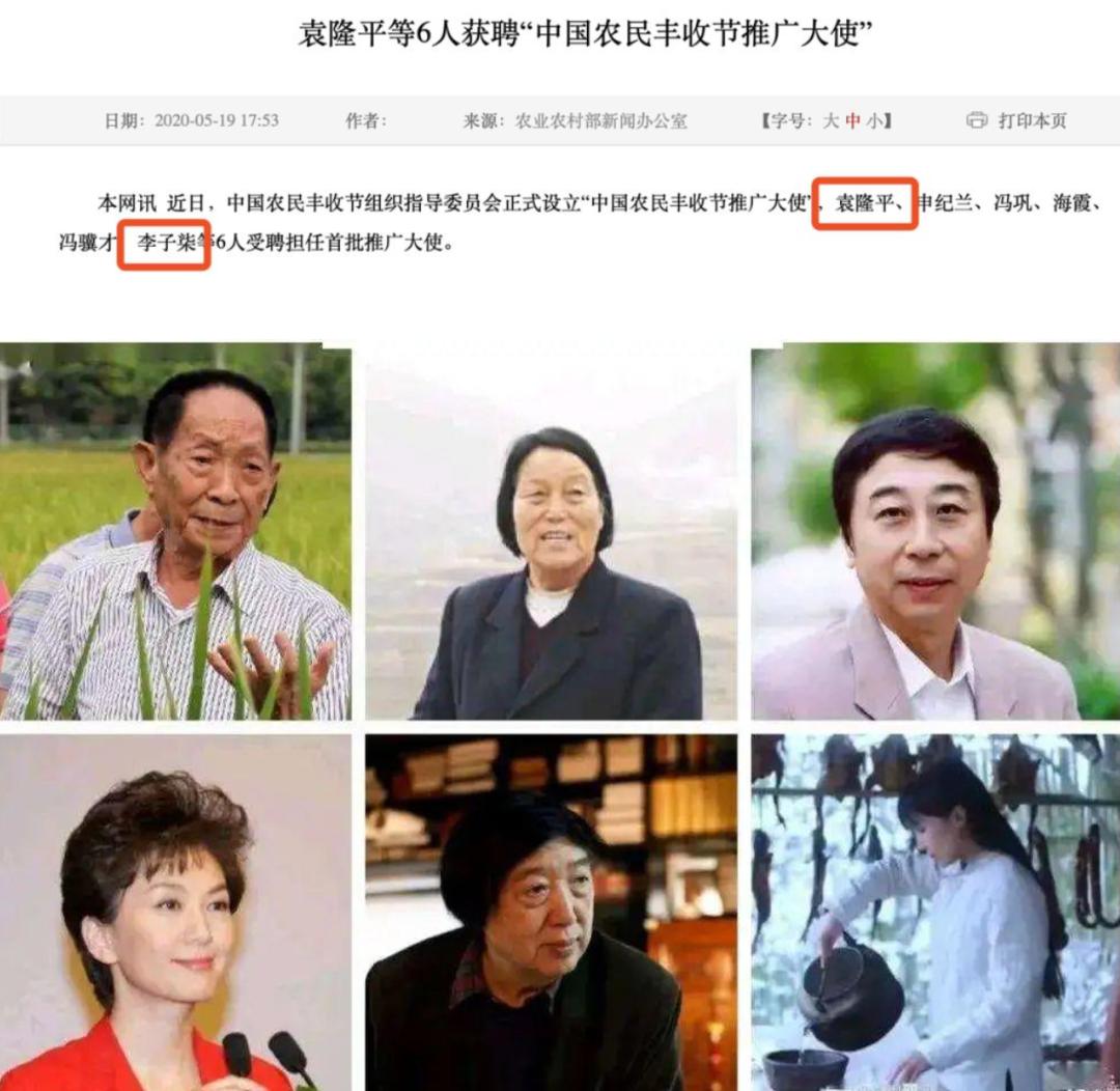 2020年,李子柒获聘为“中国农民丰收节推广大使”。该奖项获奖人全国仅6人,一同受聘的是袁隆平、申纪兰、冯巩、冯骥才、海霞。