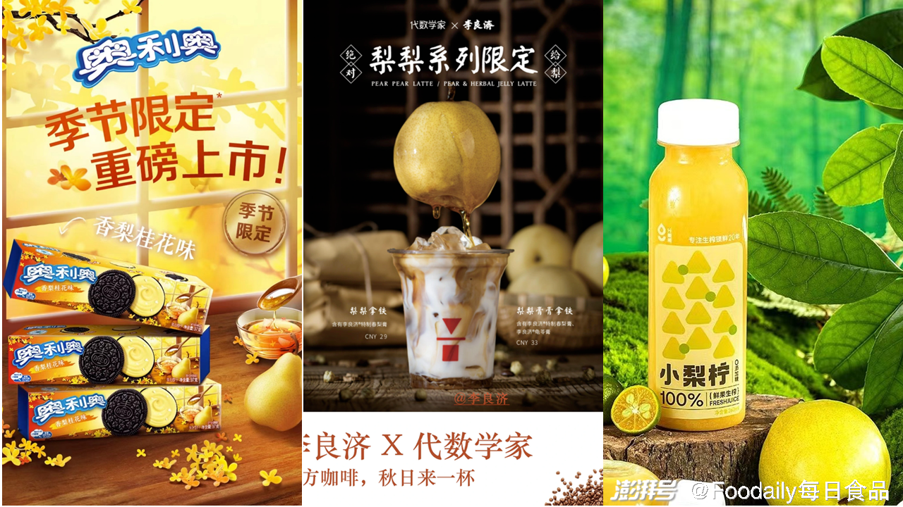 李良济 × 代数学家推出膏方咖啡——「特制梨梨系列拿铁」,瞄准梨的药食同源滋补属性,采用了李良济的春梨膏与咖啡结合,向中式养生方向靠拢。在零食品类上,「奥利奥」季节限定新口味「香梨桂花」味上市,夹心添加真实梨果粒,口感丰富。此外盒马上新果汁「HPP小梨柠复合果汁」,融合梨的清甜和小青柠的芳香,配料表只有梨和小青柠,鲜果生榨。