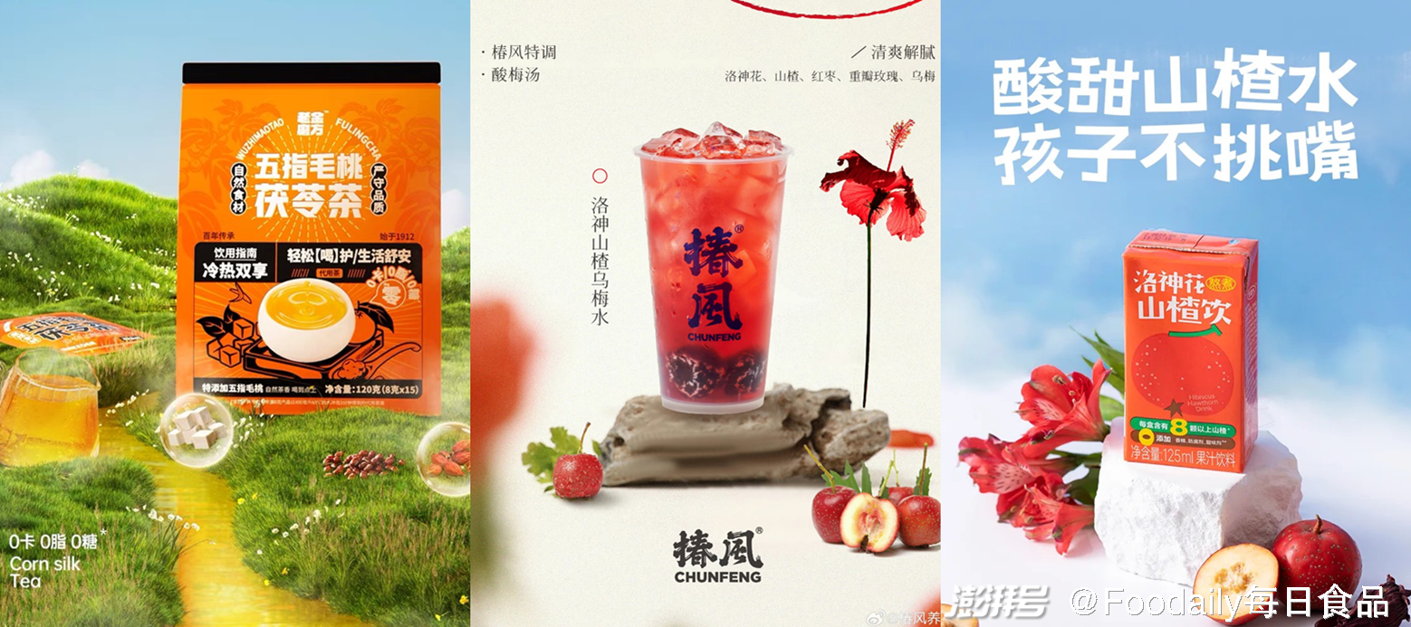 传统古法养生配方逐渐融入饮品。「老金磨方」推出「 五指毛桃茯苓茶」,采用古法配方,复配多种药食同源的珍材,例如,五指毛桃、茯苓、赤小豆、薏米仁、橘皮、甘草、芡实和苦荞麦等;以国风气泡水出圈的「好望水」,本月 推出了新品「洛神花山楂饮」,以山楂与洛神花为原料,采用传统手艺熬制而成;「椿风」推出「顺时养身茶」系列,包含姜汁桂圆红枣茶,山楂冻柠茶,洛神山楂乌梅水。