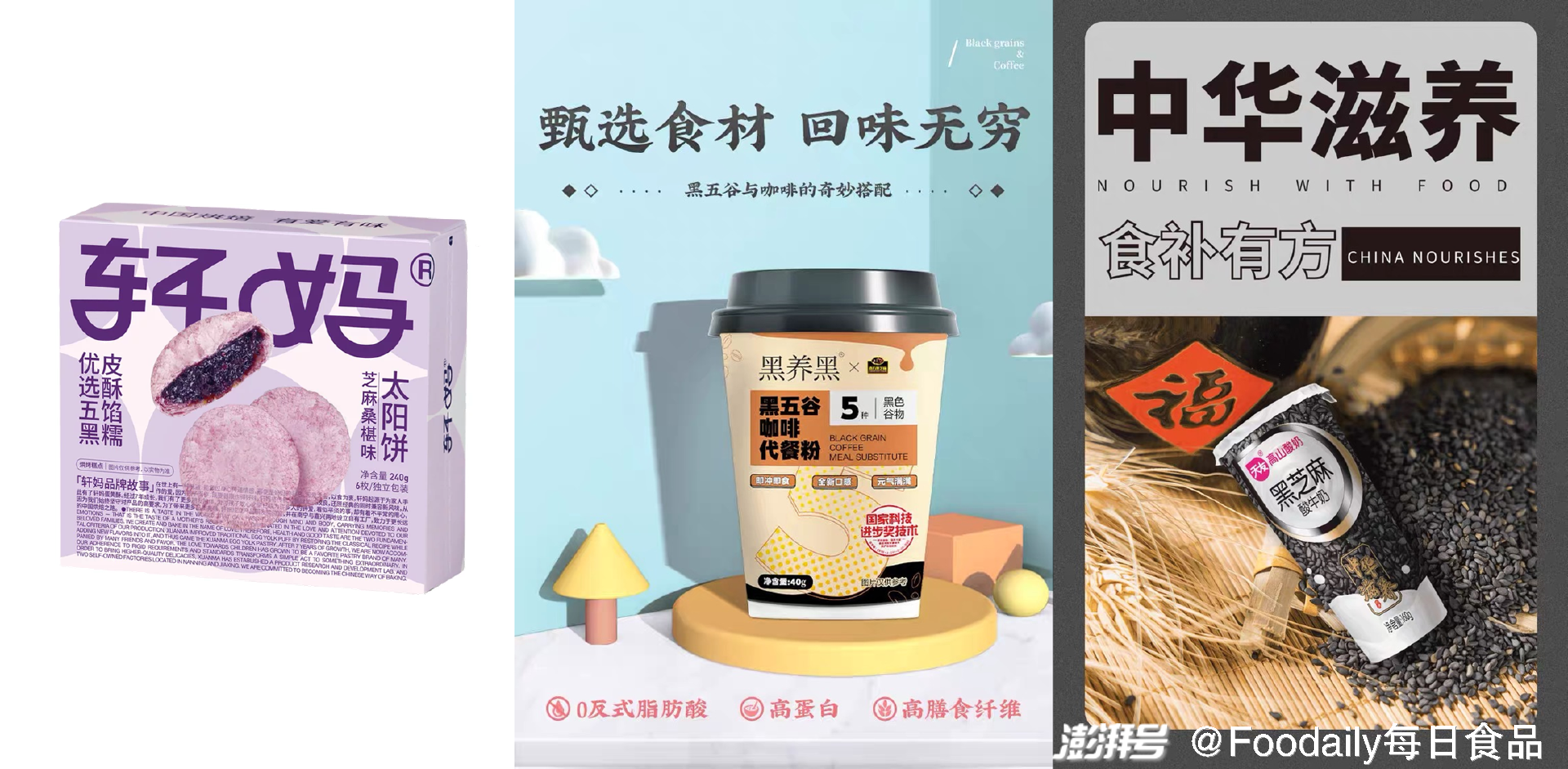 纵观整个趋势,黑色谷物更是成为各品牌滋补食养的灵感来源。「轩妈」推出「芝麻桑椹味太阳饼」,以东方温润食养为理念,搭配五种黑色谷物:黑枸杞、黑米、黑桑椹、黑豆、黑芝麻;「南方黑芝麻」推出「黑五谷咖啡代餐粉」,五种黑色谷物与咖啡粉搭配,补充黑营养,维稳肠道功能;「天友」新推出的「黑芝麻酸奶」,将黑芝麻与酸奶相结合,主打“中华滋养,食补有方”的概念。