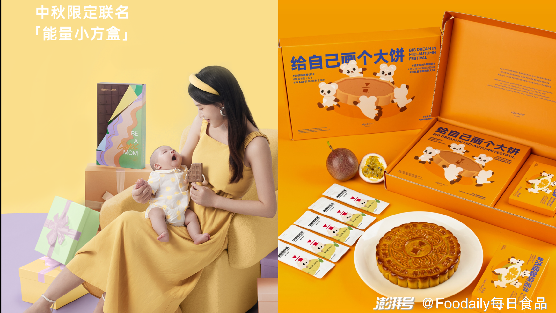 「每日黑巧」联合轻奢月子护理品牌小贝拉共同推出中秋联名「能量小方盒」,内含低糖巧克力月饼,旨在帮助孕妇提供能量补给并治愈妈妈的孕期小情绪;「代数学家」推出「果然柚是饼」月饼礼盒,关怀职场的打工人情绪,为打工人们送上“大饼”,许愿财富自由。